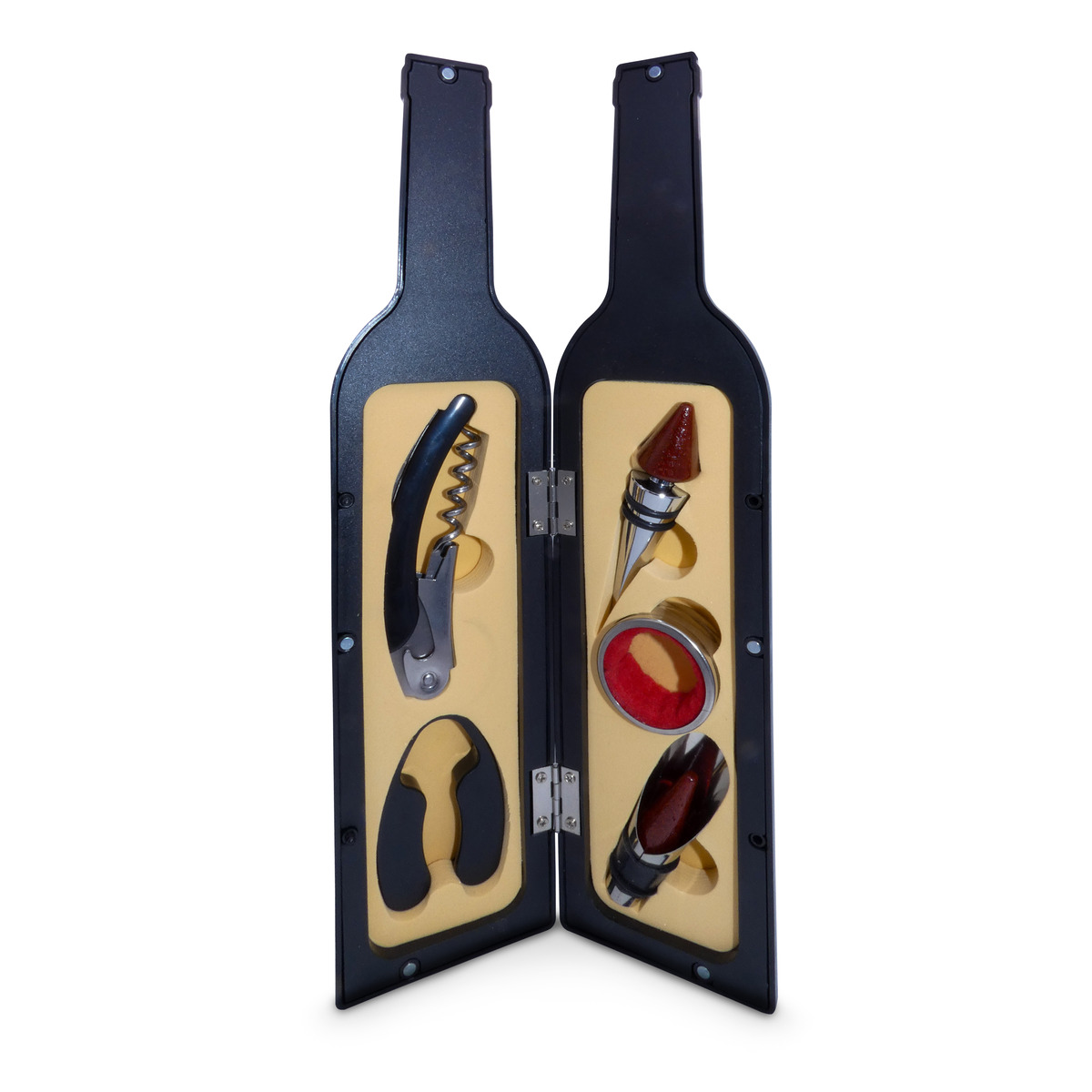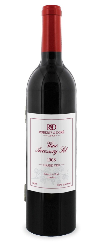 Cleverly concealed in this faux wine bottle is a 5 piece bar set, comprising a corkscrew, wine pourer, drip ring, foil cutter and bottle stopper.