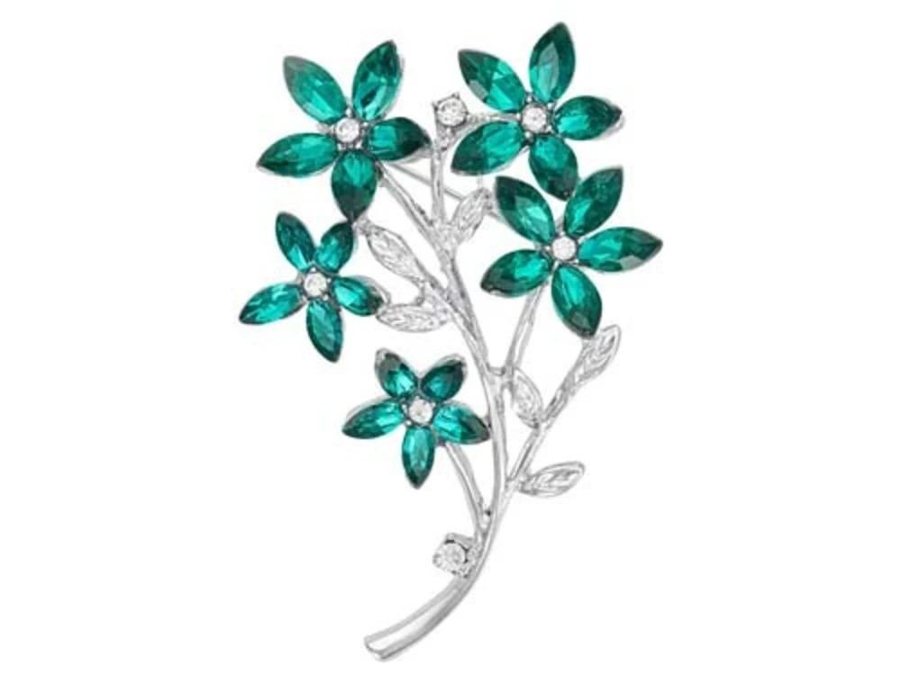 Five flowers sit at the top, each one formed from vivid emerald green, petal shaped stones arranged around a clear central gem.