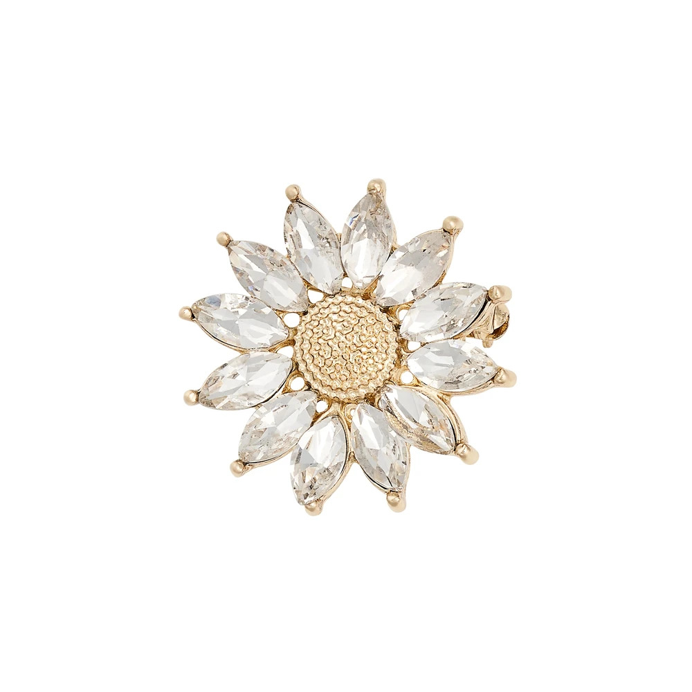 At the centre sits a textured gold finish dome, giving the piece warmth and depth. Surrounding it are twelve marquise cut clear stones, each set in gold finish mount to form elegant, petal shaped segments.