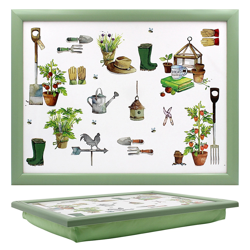 A cushioned lap tray featuring a colourful gardeningthemed illustration filled with tools, plants, and charming details. Practical for meals, laptops, or hobbies,