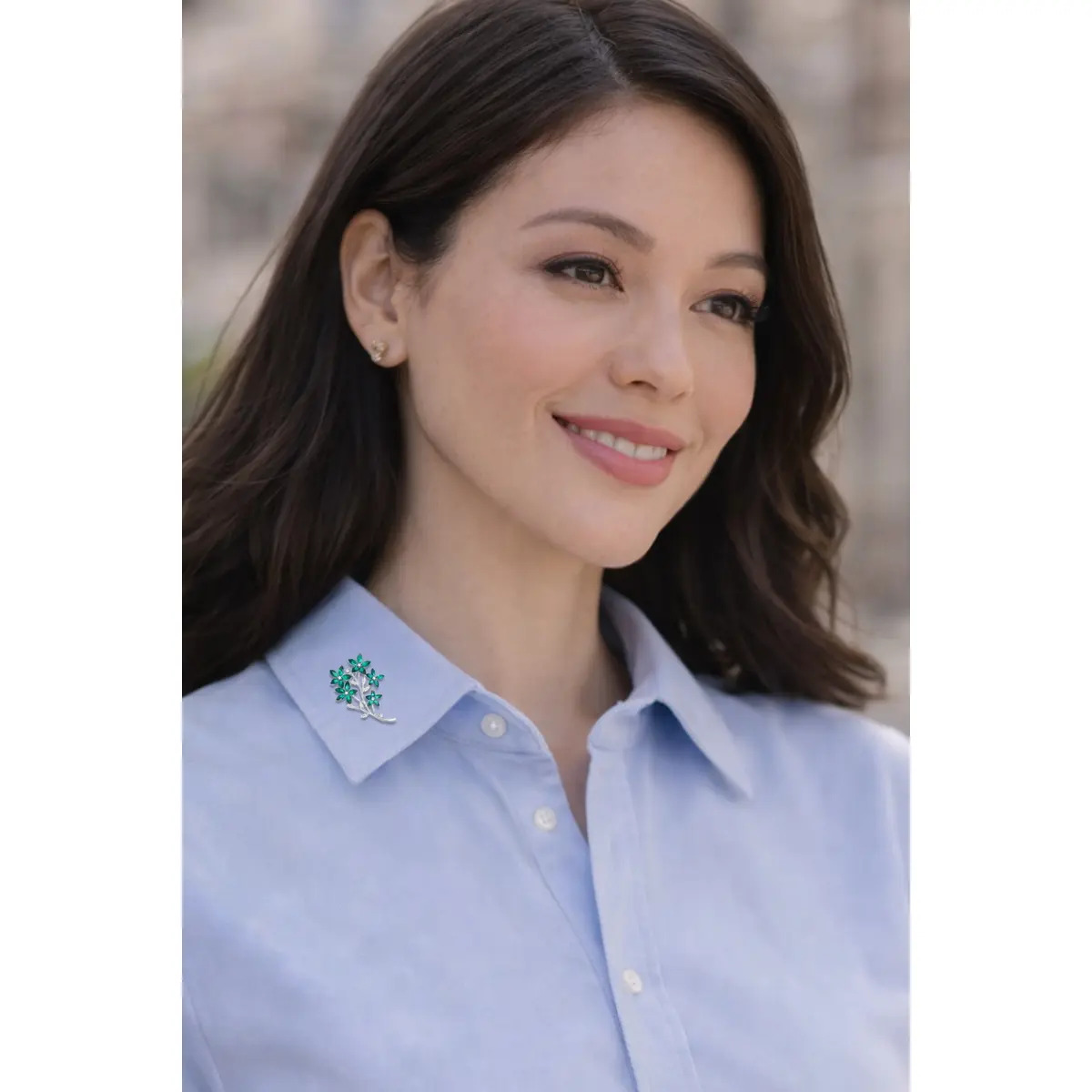 Five flowers sit at the top, each one formed from vivid emerald green, petal shaped stones arranged around a clear central gem.