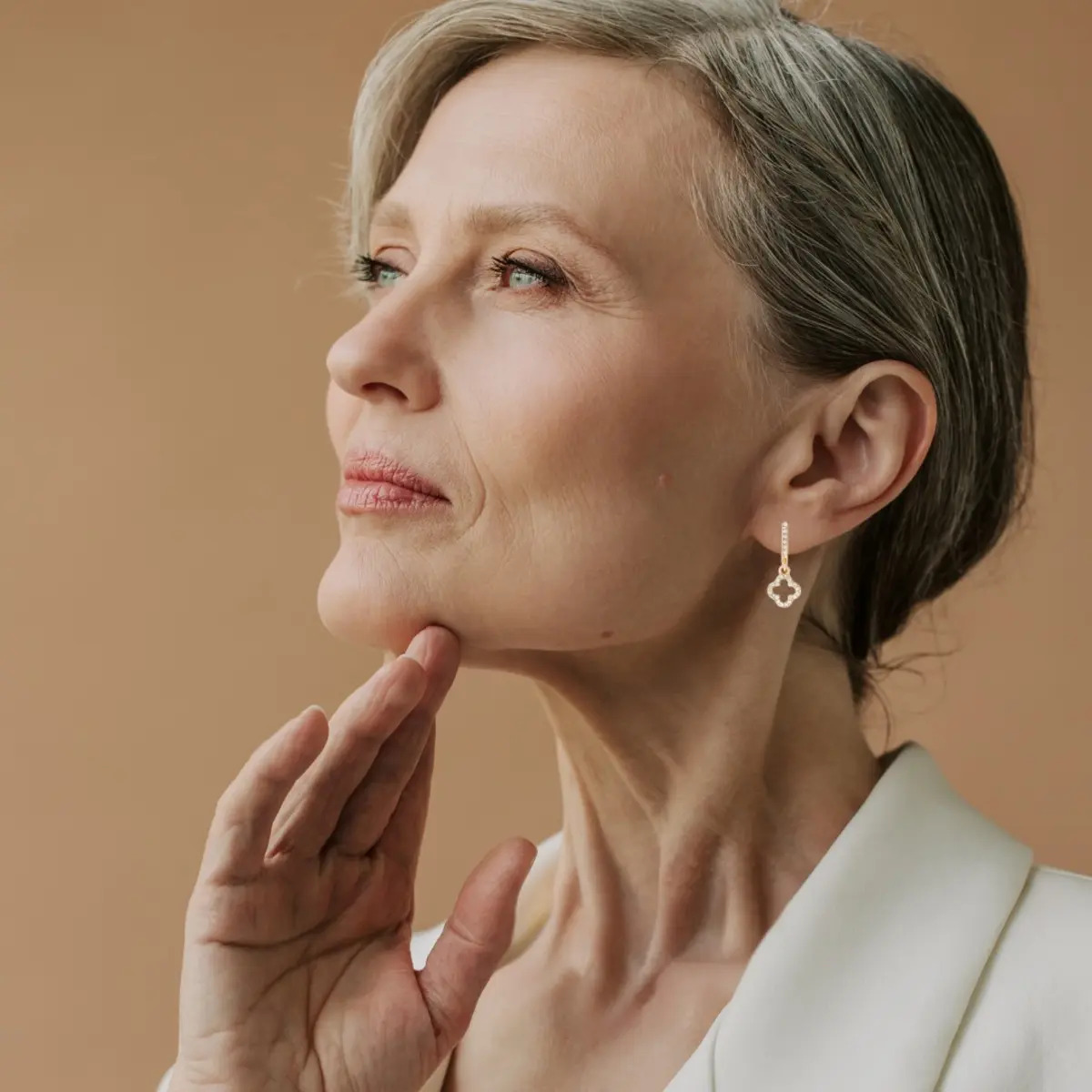 The combination of the slim, glittering hoop and the dangling, symmetrical motif makes them feel both elegant and a little playful — polished enough for evening, but still light and pretty for daytime wear.