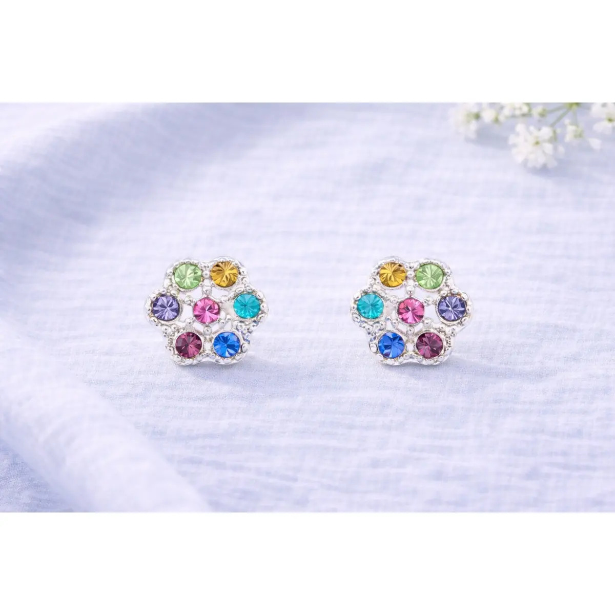 Vibrant little floral studs, each one built from seven round stones arranged like a tiny, bright blossom.