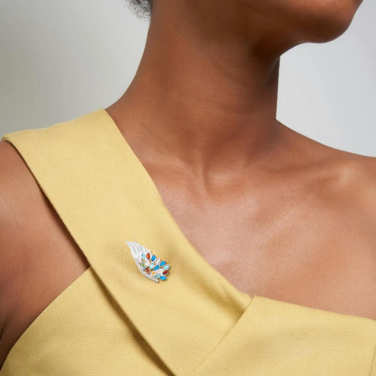 It feels ornate, lively, and very much a statement accessory; the kind of piece that lights up a lapel or evening dress with a flash of colour and elegance.