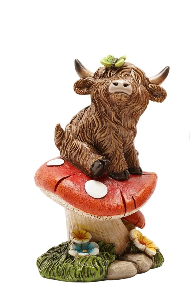 This charming figurine features the cow perched atop a bright red toadstool, complete with a tiny leaf resting on its head. Height 12.5cm