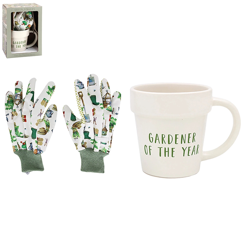 A delightful gardening duo featuring illustrated gardenthemed gloves paired with a ceramic Gardener of the Year mug.