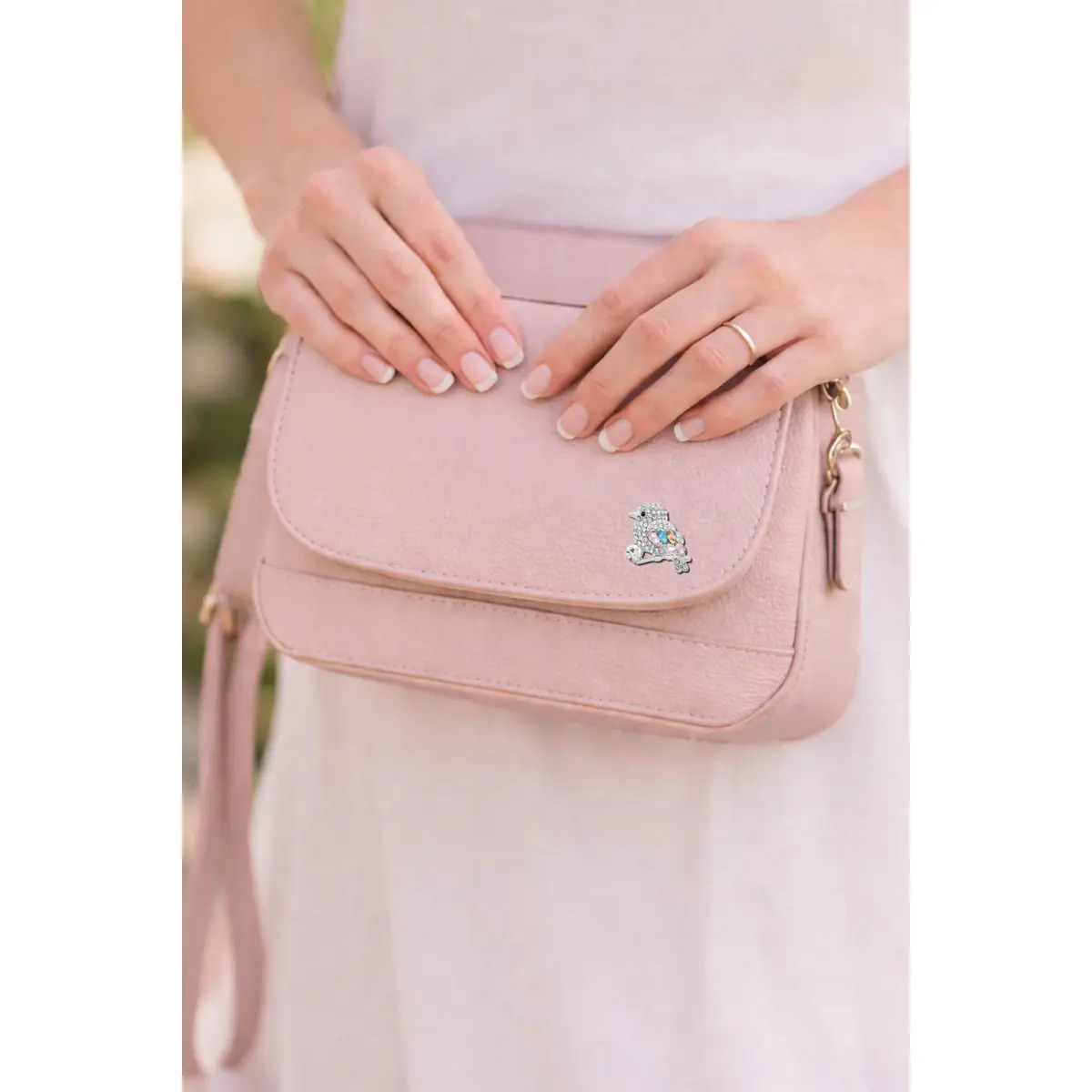 The bird’s body, head, and tail are covered in clear stones that give it a bright, shimmering surface, while a single black stone forms the eye for contrast.