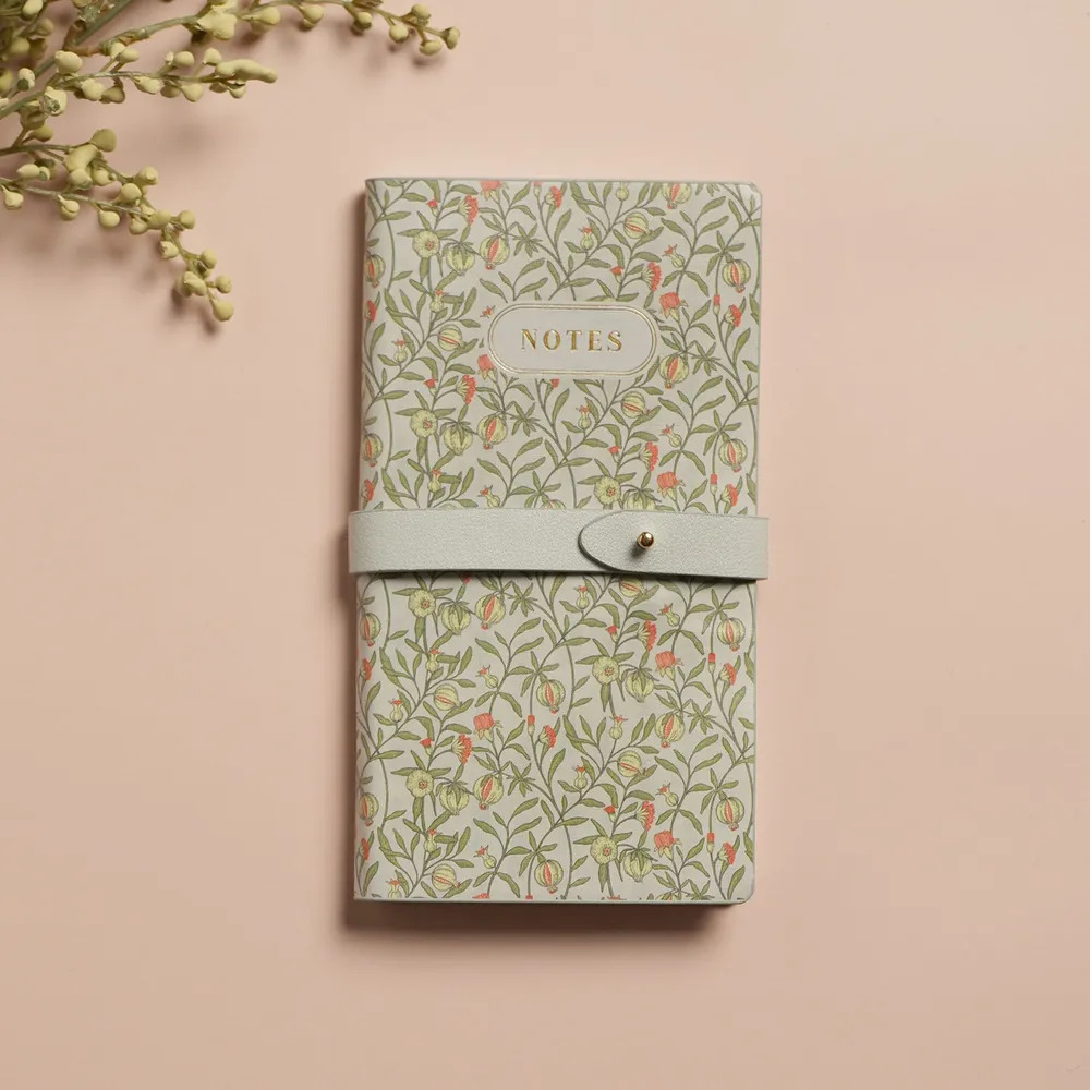 A faux leather notebook with soft floral artwork, gold detailing, and a secure buttonstrap closure the perfect place to capture your quiet thoughts and daily notes. Size 17.8cm x 10.5cm